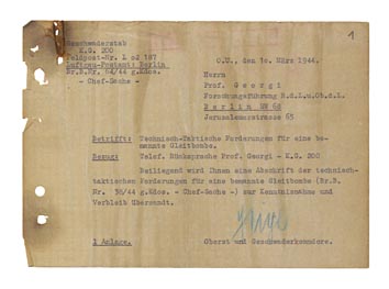 Am 10. März 1944 sandte der Geschwaderstab des K.G. 200 nach telefonischer Rücksprache mit Professor Walter Georgii (Georgi) diesem die Technisch-taktischen Forderungen für eine bemannte Gleitbombe – das Lastenheft für das Reichenberg-Gerät.